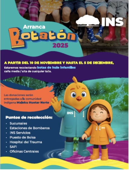 El Instituto Nacional de Seguros (INS) desarrolla la campaña “Botatón”, una iniciativa solidaria que busca recolectar botas de hule nuevas para niños y niñas de la comunidad indígena Maleku Huétar Norte, en la zona norte del país.