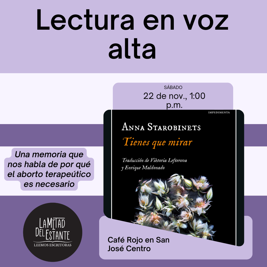 En conmemoración del Día Internacional para la Eliminación de la Violencia contra las Mujeres y ante la reciente decisión de restringir el acceso al aborto terapéutico en el país —una medida que contradice lo establecido en el artículo 121 del Código Penal—, el club de lectura de La Mitad del Estante convoca a una lectura pública y colectiva de Tienes que mirar, de la autora rusa Anna Starobinets.