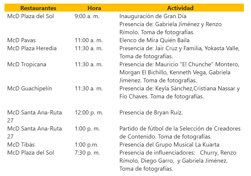 La celebración del Gran Día será una gran fiesta solidaria, en la que participarán figuras reconocidas, deportistas e influenciadores, quienes ya confirmaron su apoyo a la causa social. Estas actividades especiales se vivirán en varios restaurantes del país entre ellos: Plaza del Sol, Lindora, Plaza Heredia, Santa Ana-Ruta 27 y Guachipelín, entre otros.