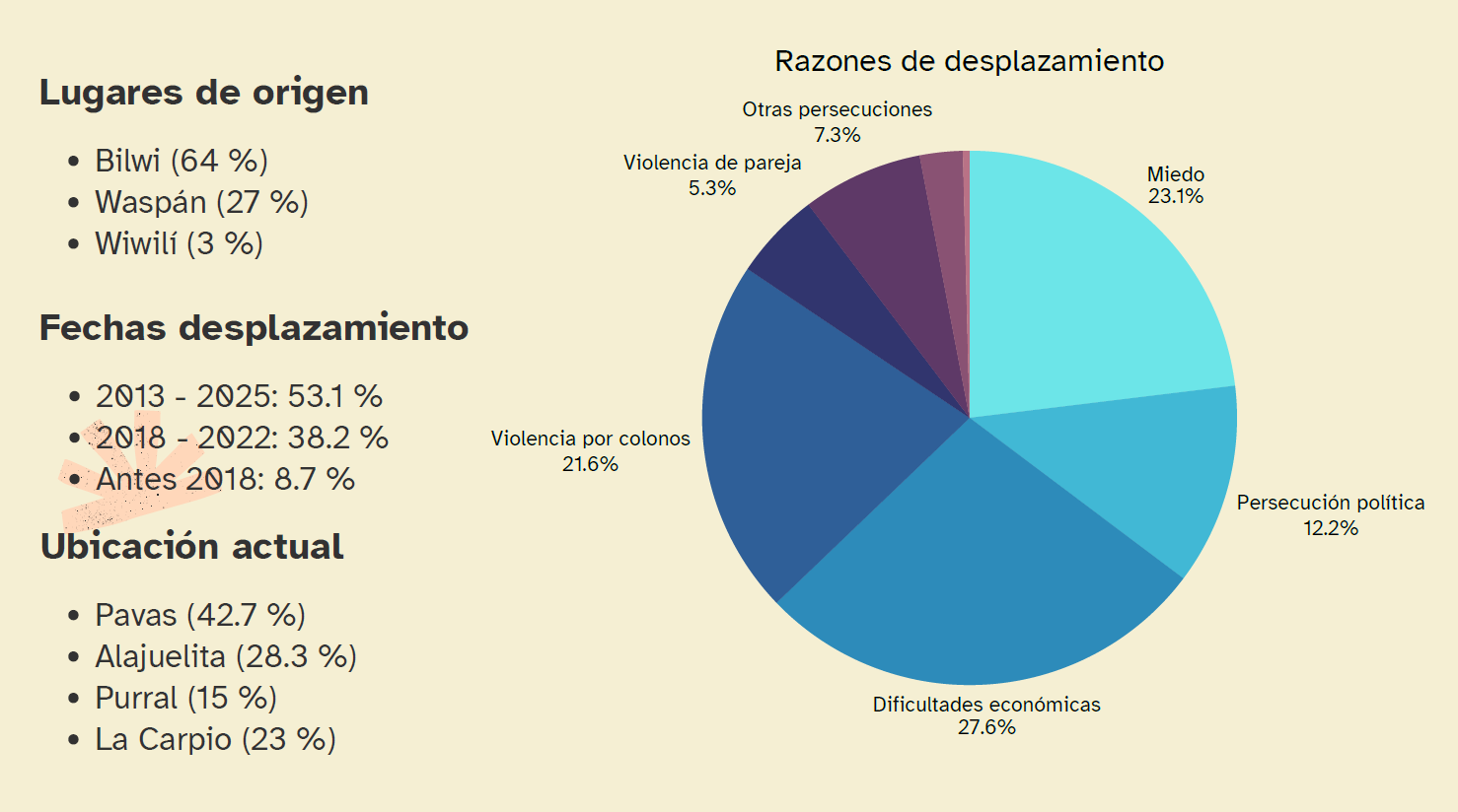 La mayoría de las mujeres desplazadas son miskitas, procedentes principalmente de Bilwi (64%) y Waspán (27%), en la Región Autónoma del Caribe Norte de Nicaragua. Sus motivos de salida incluyen miedo, violencia, persecución política, dificultades económicas, entre otros. Desde 2013, se ha registrado un flujo creciente hacia Costa Rica, concentrándose en lugares como Pavas (42.7%), Alajuelita (28.3%), La Carpio (23%) y Purral (15%), según especifica el mapeo.