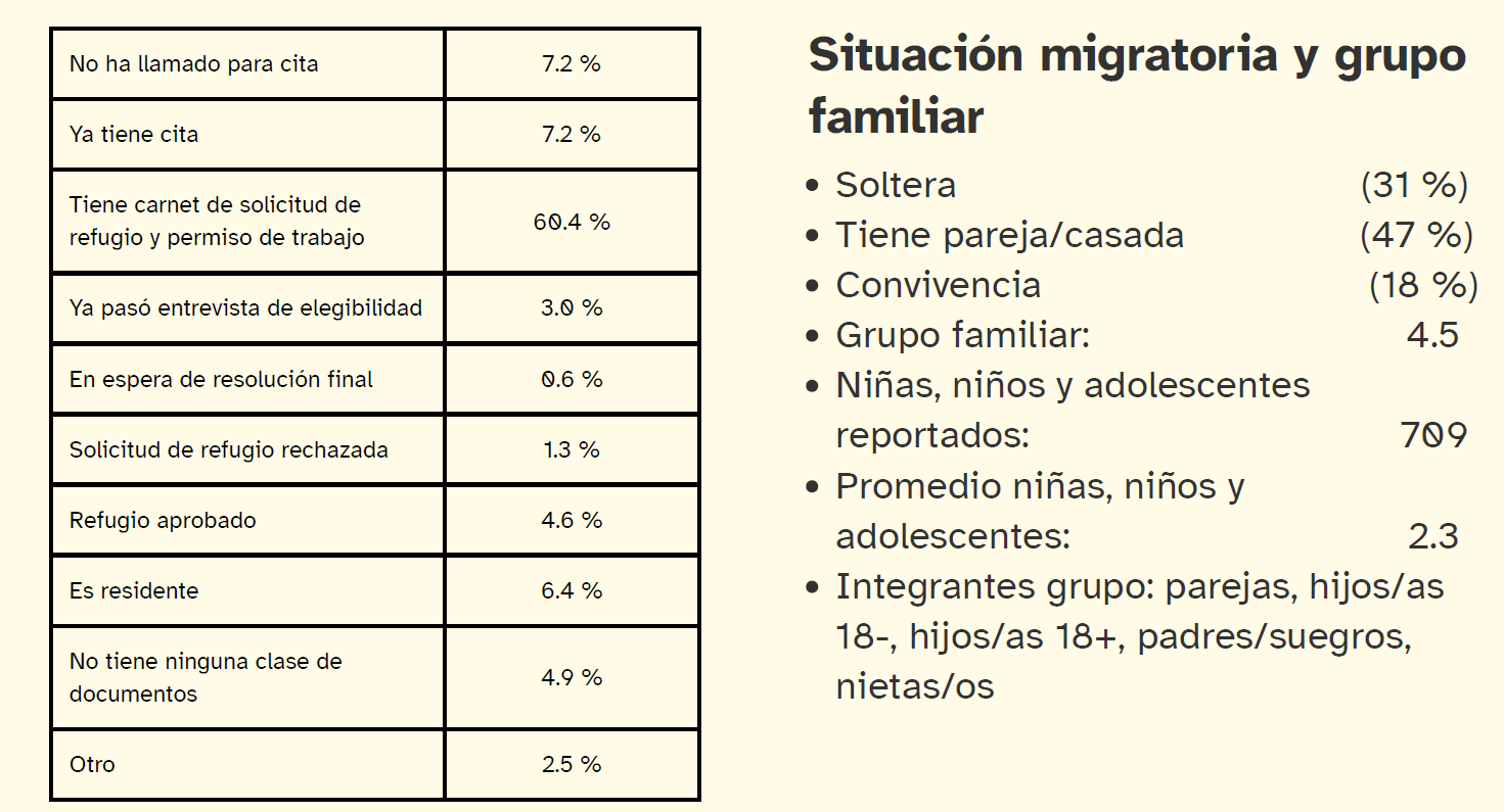 En cuanto a la regularización migratoria, más de la mitad cuenta con solicitud de refugio y permiso de trabajo; un grupo importante ya tiene refugio aprobado o residencia, mientras que un porcentaje menor no ha iniciado el trámite o le fue negado.