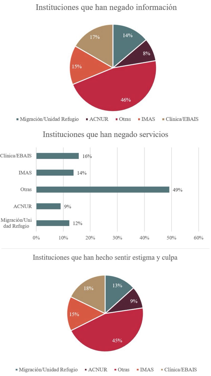 El estudio puntualiza además múltiples formas de violencia: verbal, económica, física y sexual, ejercidas principalmente por esposos, compañeros y familiares, así como violencia institucional ejercida por clínicas o Ebáis, IMAS, Migración y la Unidad de Refugio, y el ACNUR. El estudio detalla que las mujeres relatan sentirse estigmatizadas, discriminadas y culpabilizadas en el acceso a servicios y trámites por ser indígenas desplazadas.