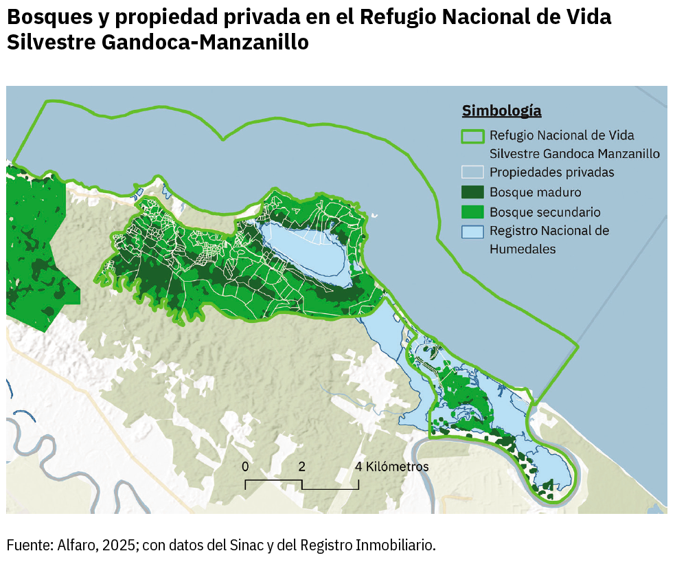 De acuerdo con las estimaciones de Alfaro (2025), aproximadamente el 26% del bosque maduro, el 39,5% del secundario y cerca del 37,9% de los humedales del refugio se encuentran dentro de propiedades privadas, una situación que por la modalidad del Área Silvestre Protegida (ASP) cabe recordar que es legal”.