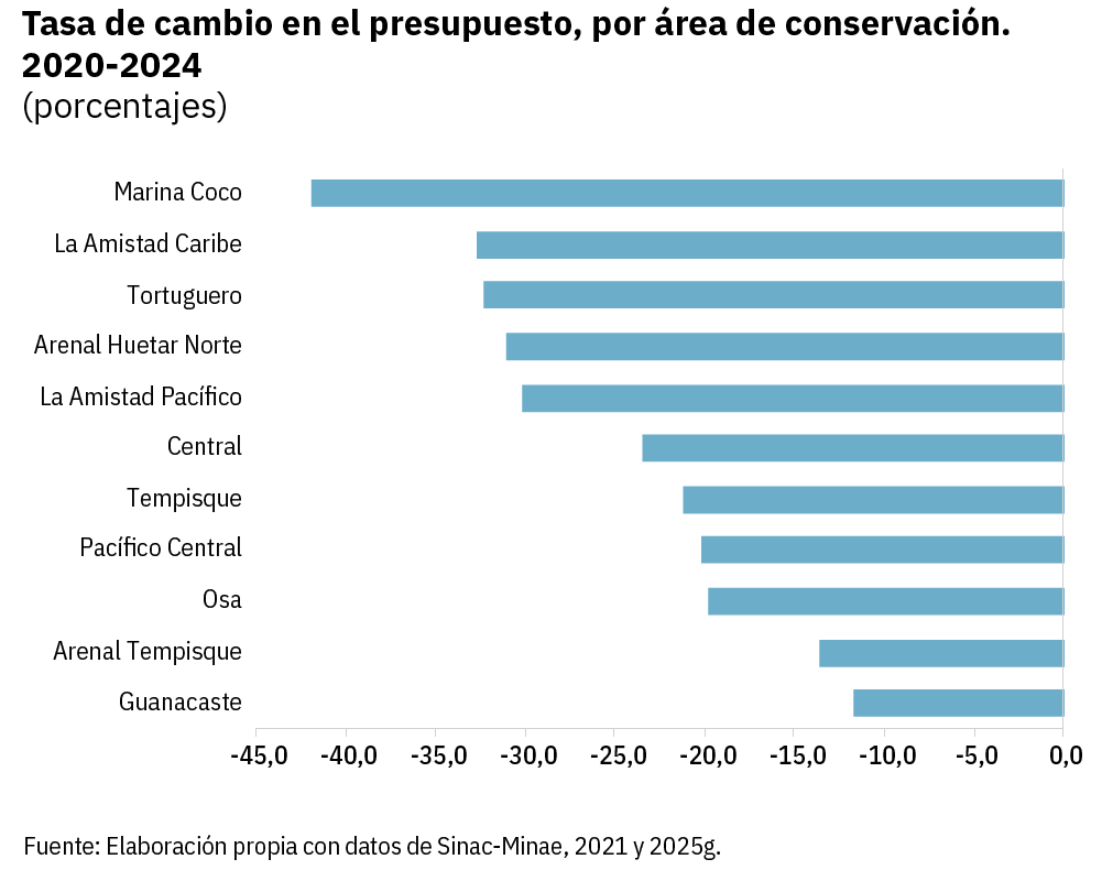 El informe puntualiza que el debilitamiento institucional se agrava con la caída en los recursos financieros y humanos. Por ejemplo, el presupuesto del Sinac se redujo 40% entre 2020 y 2024, pasando de ₡44.029 millones a ₡26.420 millones, pese a que la superficie bajo protección ambiental aumentó más del 500%, tras la ampliación de las áreas marinas del Parque Nacional Isla del Coco y Montes Submarinos. El Área de Conservación Marina Coco fue el más afectado, con una reducción de 41,9% en su asignación; esta última tutela la tercera parte de la superficie marina bajo protección en el país.