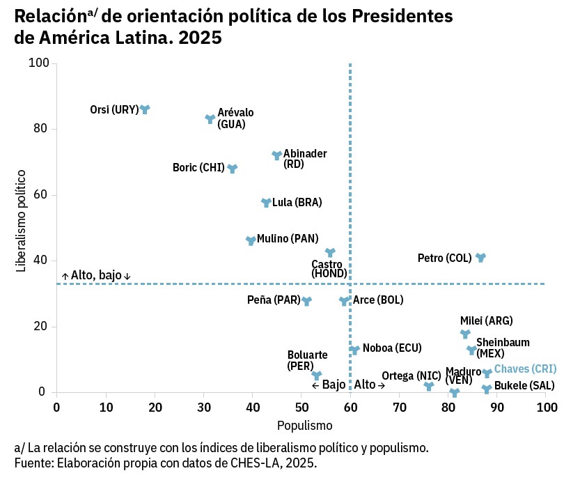 El informe señala que, para una democracia, la combinación ideal de su máximo jerarca sería aquella en la cual se den altos niveles de liberalismo político y bajo nivel de populismo, sin embargo, los resultados colocan a Chaves en el extremo opuesto, a la par de mandatarios como Daniel Ortega (Nicaragua), Nicolás Maduro (Venezuela) y Nayib Bukele (El Salvador).