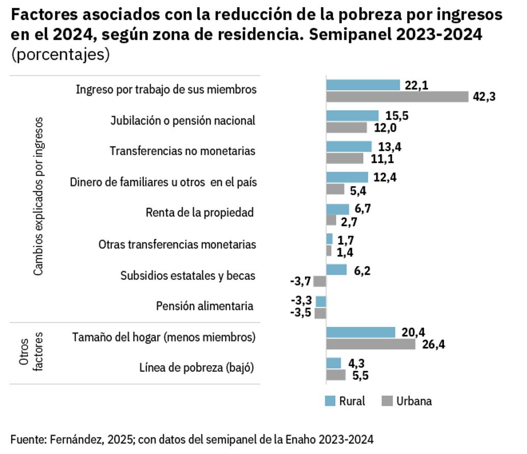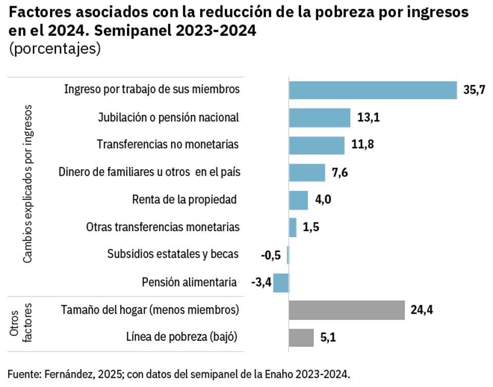 La mejora en los ingresos de los hogares que dejaron de ser pobres [en 2024] se debió a factores como el empleo informal (una tercera parte), la reducción del tamaño del hogar (una cuarta parte), el aumento de los ingresos de fuentes no registradas (una quinta parte) y la recepción de más pensiones contributivas (13%)”.