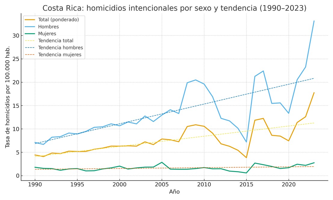 Costa Rica enfrenta hoy uno de los aumentos más acelerados de homicidios intencionales en toda su historia estadística reciente. De acuerdo con la UNODC (Oficina de las Naciones Unidas contra la Droga y el Delito), la tasa ponderada de homicidios —ajustada por la proporción real de hombres (49,4%) y mujeres (50,6%)— llegó a 17,7 por cada 100.000 habitantes en 2023, la más alta desde que existen registros comparables y más del doble del nivel observado hace apenas una década. El dato sería grave por sí mismo. Pero lo que la mayoría no está viendo —y que es imprescindible discutir— es quiénes están muriendo.