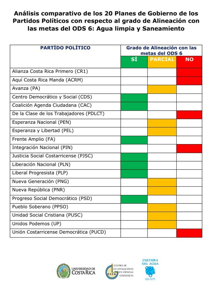 Otros diez partidos muestran una alineación parcial, mientras que tres — Alianza Costa Rica Primero (CR1), Integración Nacional (PIN) y Unión Costarricense Democrática (PUCD)— no presentan propuestas relacionadas con el ODS 6.