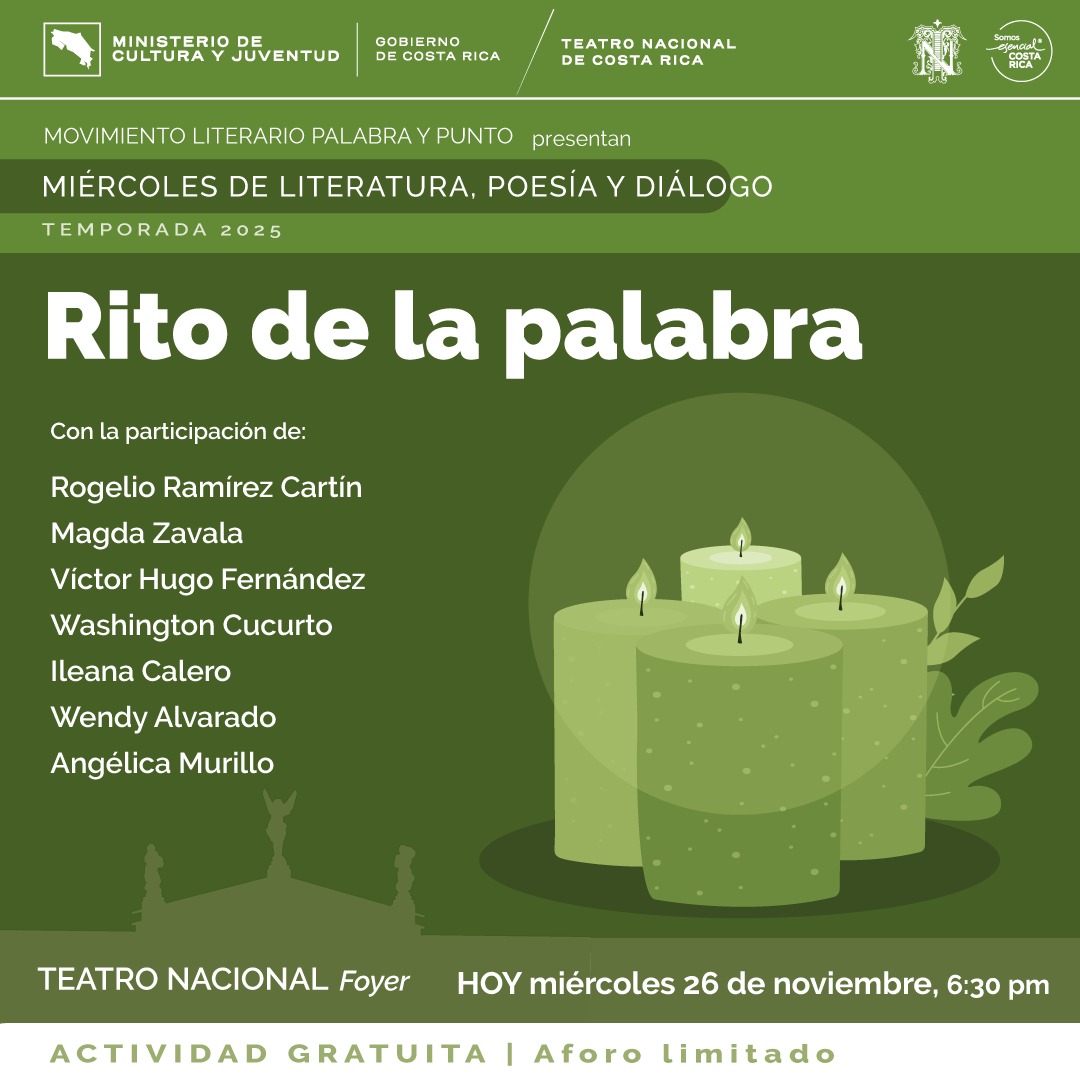 La temporada poética 2025 del ciclo Miércoles de Literatura, Poesía y Diálogo llegará a su cierre este miércoles con el recital Rito de la Palabra, una iniciativa conjunta del Ministerio de Cultura y Juventud (MCJ) y la plataforma Palabra y Punto, que se ha propuesto fortalecer la presencia de la poesía en el país.