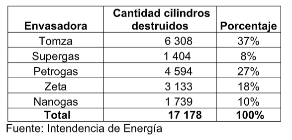 La destrucción de los envases se realiza mediante una recicladora de desechos metálicos autorizada. Para cada lote de cilindros que se elimina la empresa emite una certificación. Del total de cilindros destruidos el 48% corresponde a recipientes de aluminio.