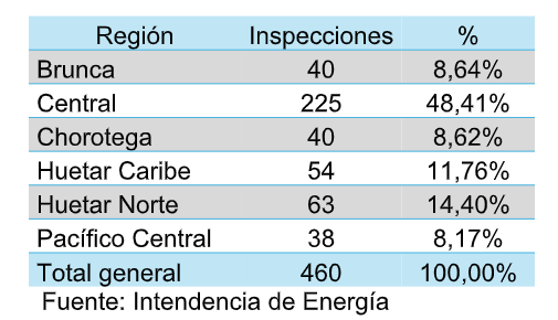 La mayor cantidad de inspecciones se efectuó en la Región Central, con un total de 225, lo que representa el 48,41% de las visitas. En la siguiente tabla se muestra el desglose por Región: