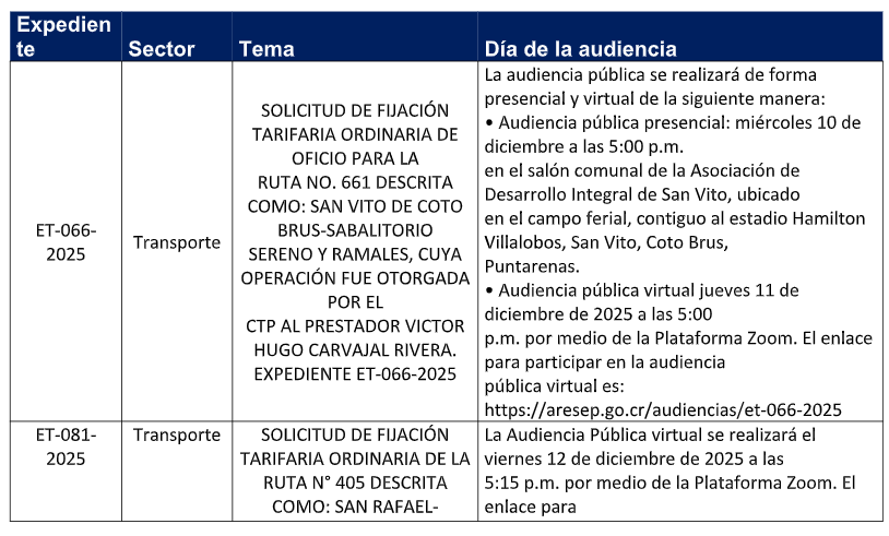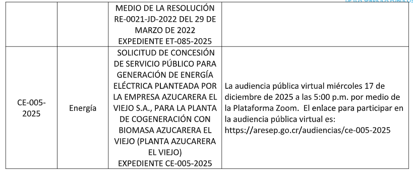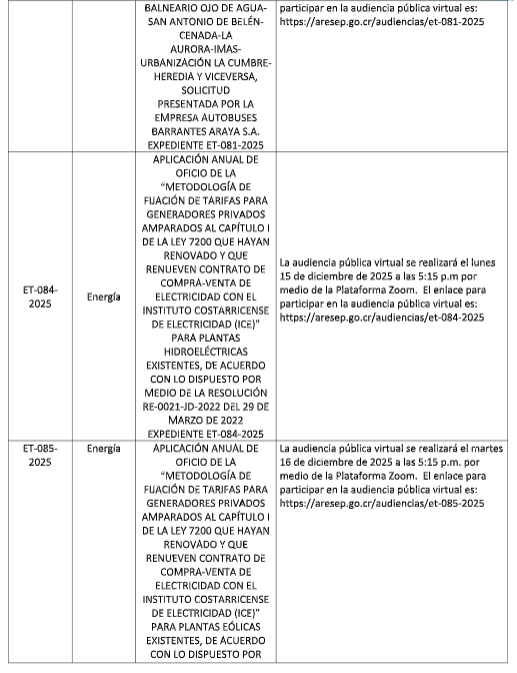 La Autoridad Reguladora de los Servicios Públicos (Aresep) convoca a audiencias públicas en este mes de diciembre, para conocer propuestas de cambio en tarifas de servicios públicos.