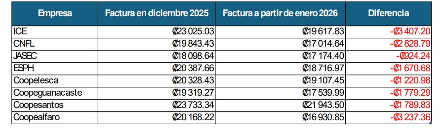 A manera de ejemplo, para un hogar con un consumo promedio de 250 kWh mensual, la disminución estimada en la facturación será de ¢3400 para abonados de la CNFL, ¢1779 para clientes de Coopeguanacaste y ¢1789 para los abonados de Coopesantos.
