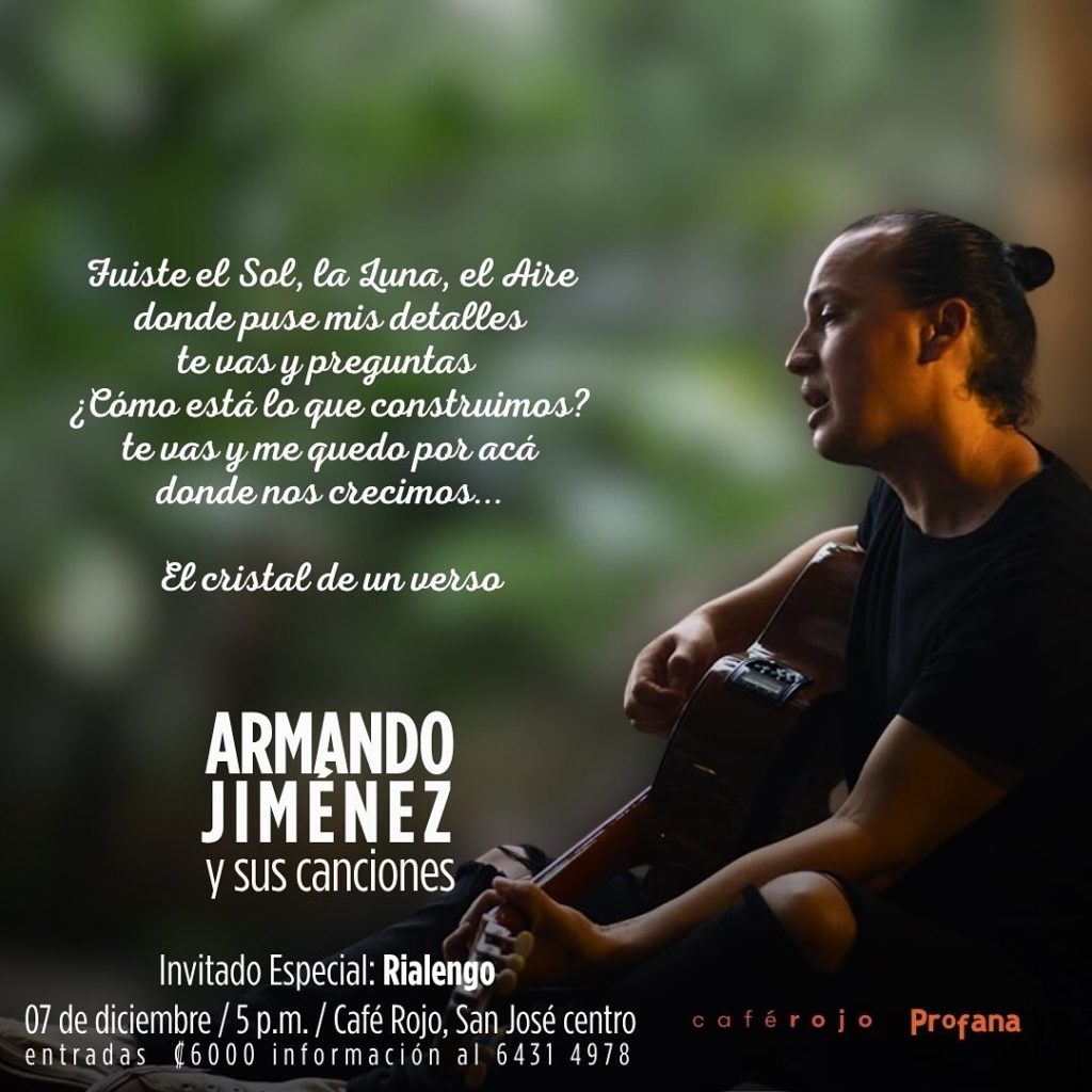 El cantautor costarricense Armando Jiménez se presentará en un concierto íntimo el domingo 7 de diciembre a las 5:00 p. m. en Café Rojo, en el centro de San José. El evento tendrá un aforo limitado y un costo de ₡6.000.