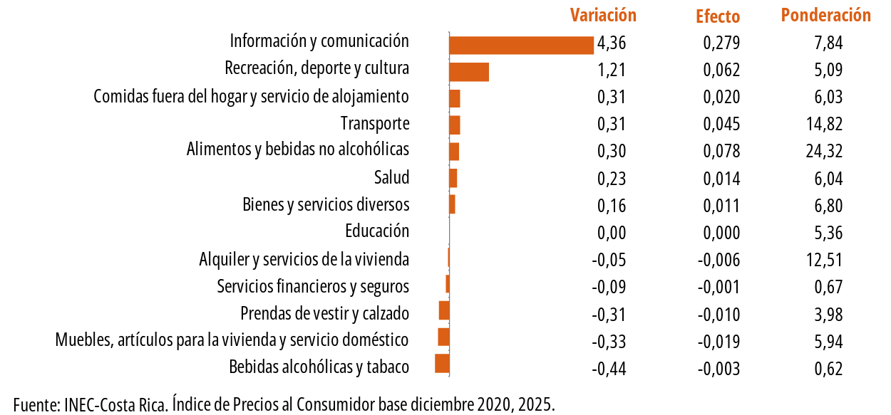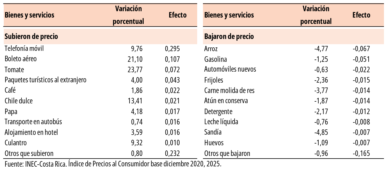 En noviembre de 2025, el Índice de Precios al Consumidor aumentó por segundo mes consecutivo, reflejando una variación mensual de 0,47%. Este es el porcentaje de incremento mensual más alto que ha registrado el indicador en lo que va del año y se explica principalmente por aumentos de precios que se presentaron en telefonía móvil, boleto aéreo, tomate, paquetes turísticos al extranjero, café, entre otros. En el caso de telefonía móvil, el incremento en los precios se explica principalmente por la finalización de una oferta en varios planes de telefonía pospago de una de las empresas proveedoras del servicio y que vino a compensar una disminución superior al 8% que se había presentado durante el mes de septiembre. En el caso de boleto aéreo y paquetes turísticos al extranjero, el incremento en los precios está asociado al inicio de la temporada alta en el turismo a nivel nacional e internacional, lo que genera una mayor demanda de estos servicios".
