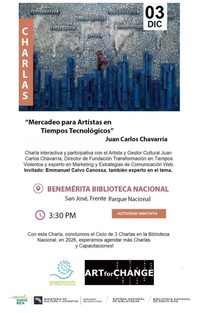 Espacio formativo para artistas visuales, escritores y gestores culturales sobre estrategias actuales de mercadeo digital y posicionamiento creativo. Expositor: Juan Carlos Chavarría. Invitado especial: Emmanuel Calvo Canossa.
