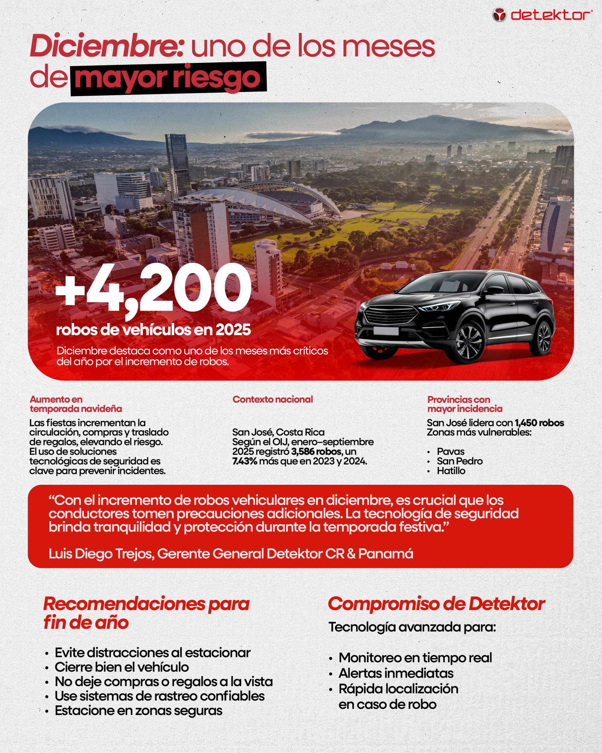 “Diciembre es el mes de mayor actividad para muchos, pero también para los delincuentes, especialmente cuando hablamos de robos vehiculares. Con el notable incremento en estos delitos durante las festividades, es crucial que los conductores tomen precauciones adicionales. Por medio de soluciones tecnológicas, no solo protegen el vehículo, sino que también brindan tranquilidad para disfrutar las celebraciones de fin de año con seguridad”, afirmó Luis Diego Trejos, gerente general de Detektor Costa Rica y Panamá.