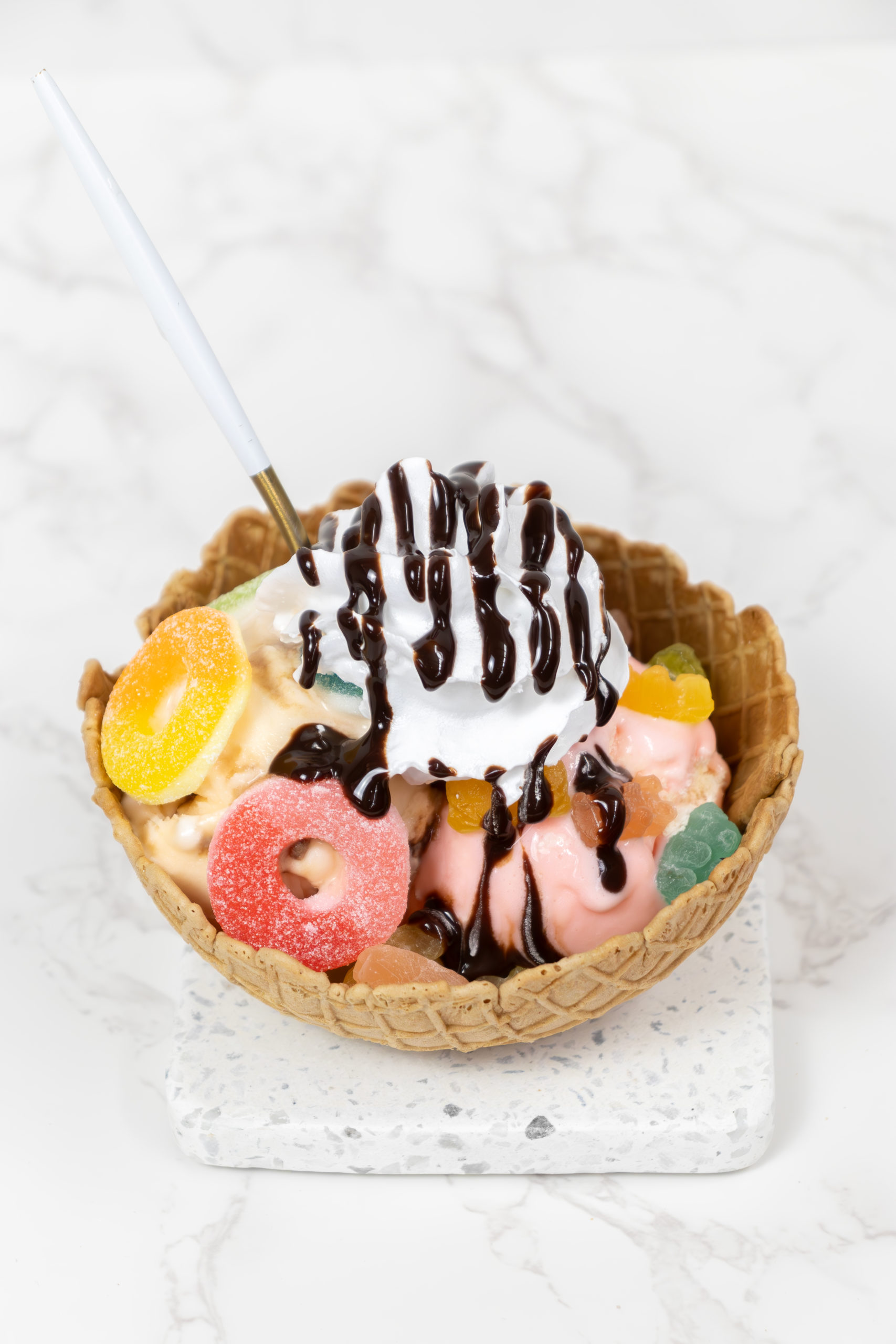 La marca destaca por sus presentaciones variadas: conos, canastas desechables, canastas comestibles y milkshakes, todo servido al momento.