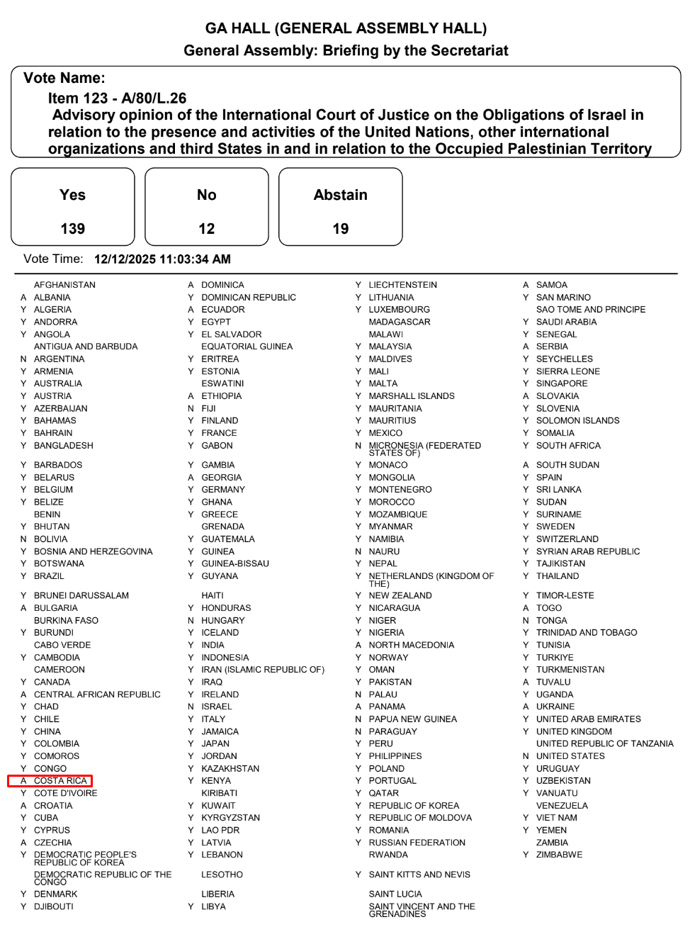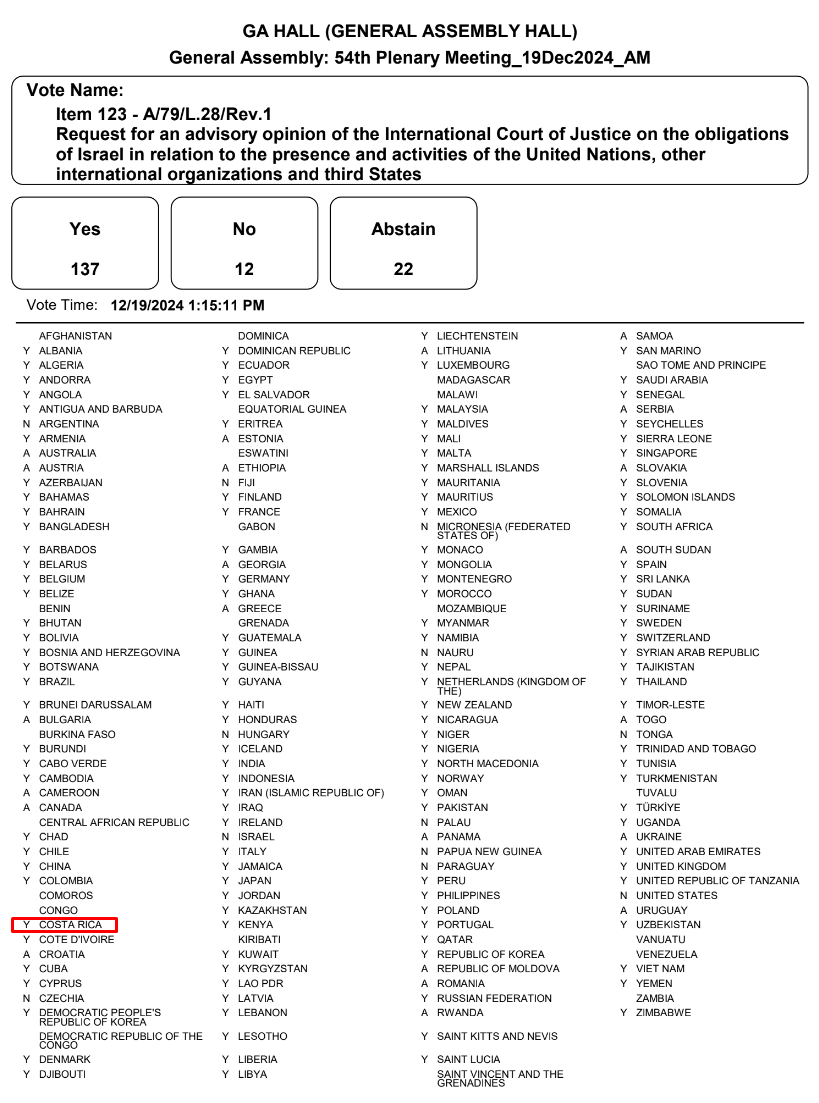 Registro oficial de votación de la resolución de 2024 que pedía la opinión de la Corte Internacional de Justicia, y que muestra a Costa Rica votando "a favor". Las "Y" significan un voto a favor; las "N" significan un voto en contra y las "A" significan abstenciones. Los países sin letra implican ausencia a la votación.