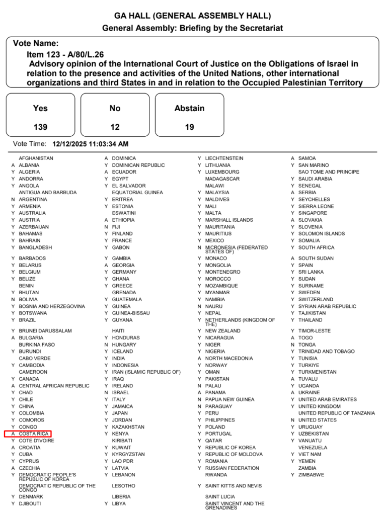 En diciembre de 2024 Costa Rica votó a favor de pedir la opinión de la Corte Internacional, cuyo resultado ahora se abstuvo de apoyar.