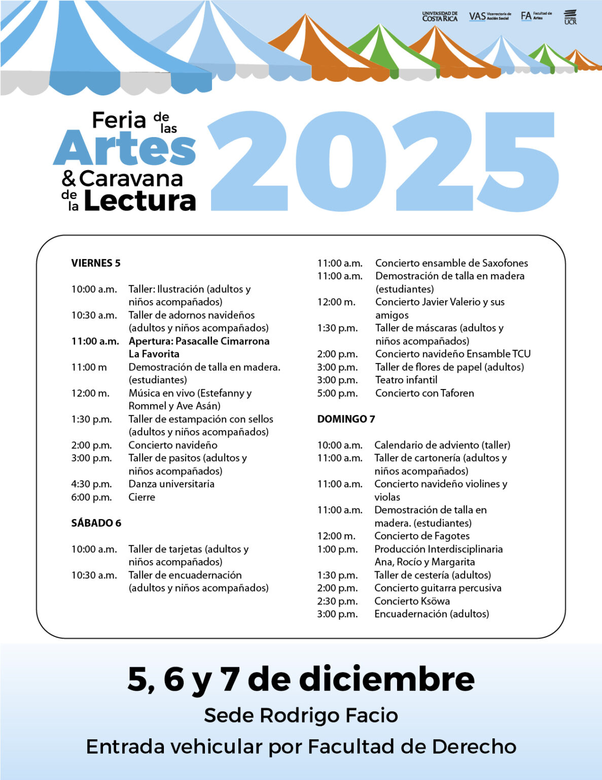 La sede Rodrigo Facio de la Universidad de Costa Rica (UCR) se llenará de arte, literatura y creatividad con la edición 2025 de la Feria de las Artes y la Caravana de la Lectura, actividades organizadas por la Facultad de Artes que se realizarán del 5 al 7 de diciembre. La comunidad universitaria y el público general podrán disfrutar de talleres, conciertos, obras de teatro, presentaciones de danza, exhibiciones y una amplia variedad de propuestas artísticas.