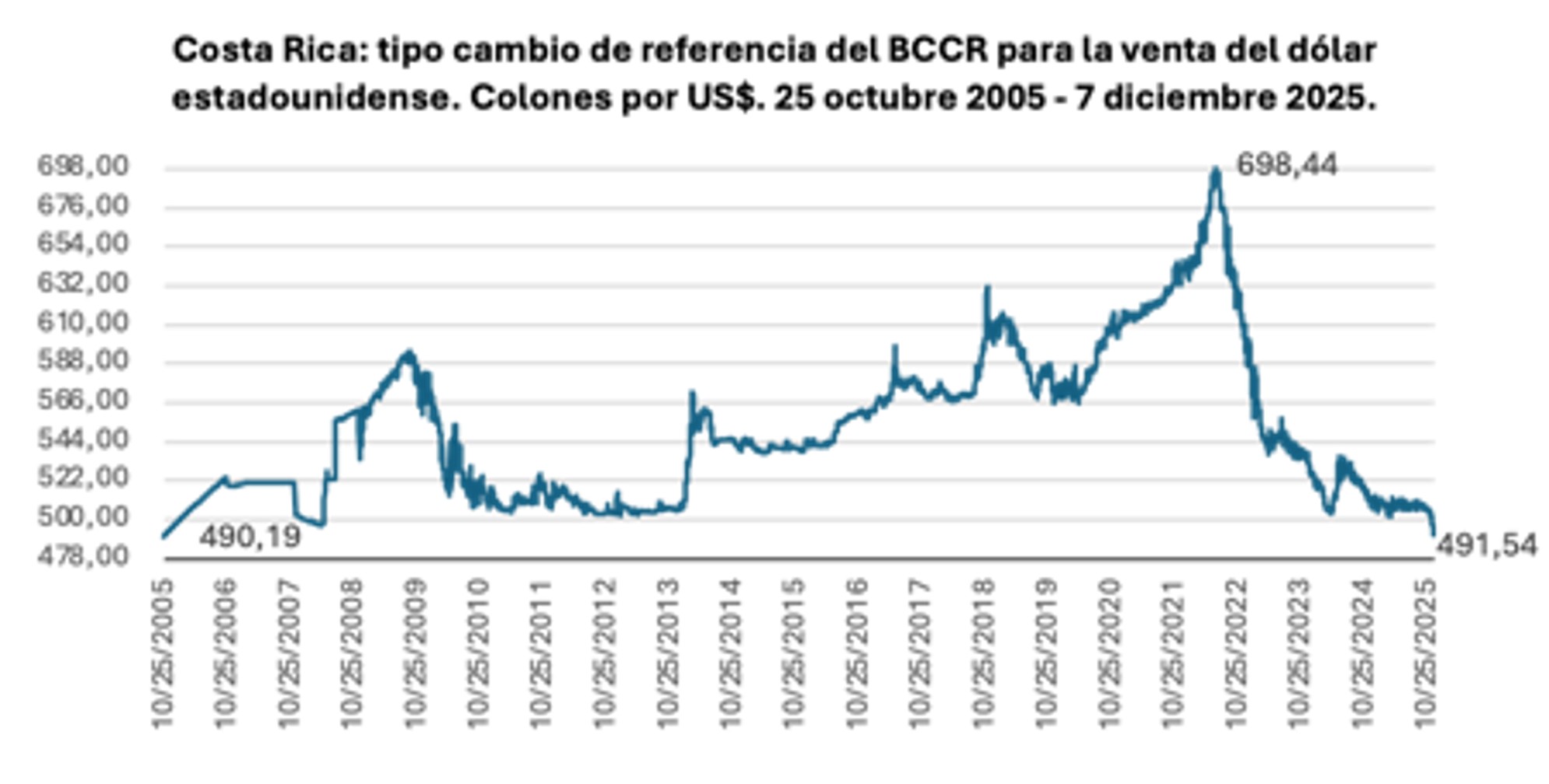 El tipo de cambio de referencia del BCCR para la venta del dólar estadounidense se ubicó en ¢491,54 el 7 de diciembre de 2025, mientras que el precio de referencia para la compra fue de ¢485,15. La última vez que el tipo de cambio de venta se aproximó a ¢491 por dólar fue en octubre de 2005; es decir, en los últimos días, el valor del dólar alcanzó niveles similares a los registrados hace veinte años.