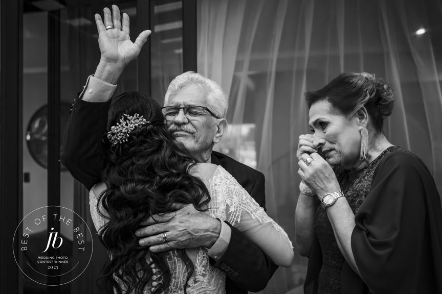 La imagen premiada fue capturada durante la preparación de la novia en la intimidad de su hogar familiar, en un residencial privado de Sabanilla, San José. La escena, lejos de buscar espectacularidad, destaca por su profundidad emocional: un momento genuino que involucra a los abuelos de la novia, figuras esenciales en su vida.