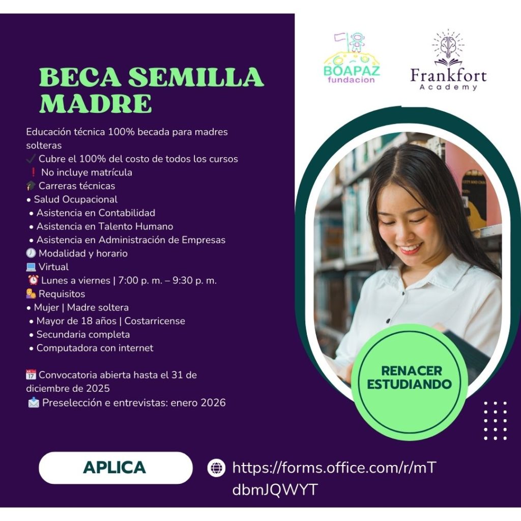 La Fundación BoaPaz, en alianza con Frankfort Academy, anunció el lanzamiento de la Beca Semilla Madre, una iniciativa educativa dirigida a madres solteras costarricenses que no cuentan con formación universitaria y que enfrentan barreras estructurales para acceder a oportunidades de estudio y empleabilidad.