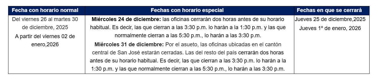 El Banco de Costa Rica (BCR) informa que para este fin y principio de año sus oficinas a nivel nacional tendrán los siguientes horarios: