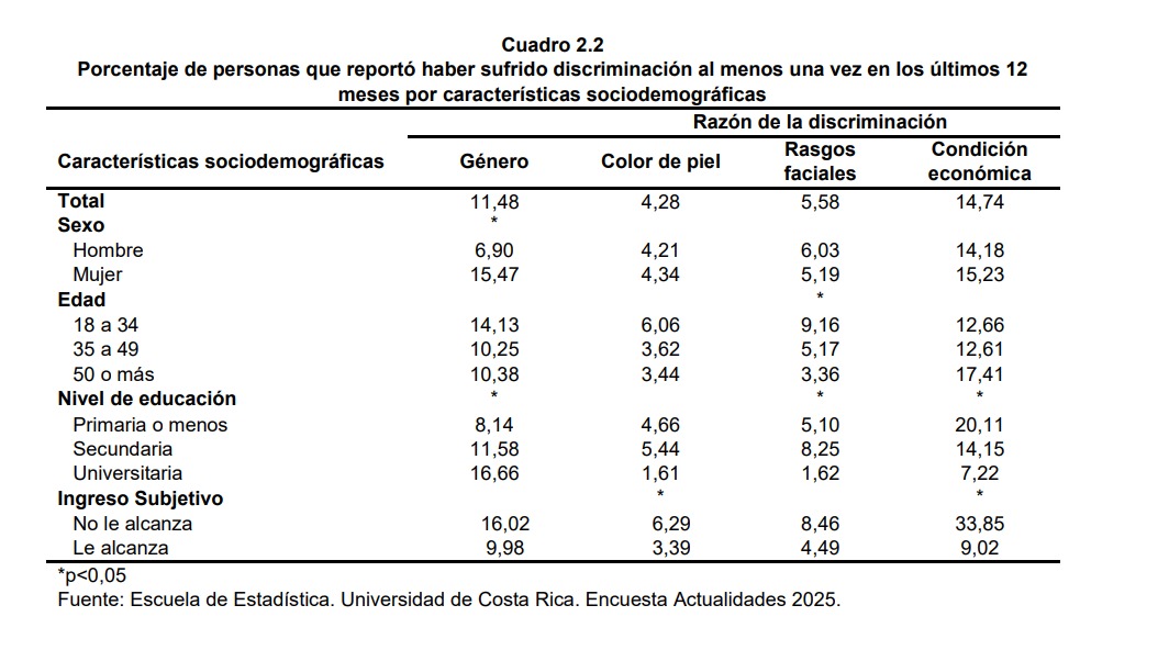 Las actitudes discriminatorias y las experiencias de trato injusto continúan presentes en la sociedad costarricense, según evidencia el apartado sobre Actitudes hacia la discriminación de la Encuesta de Actualidades 2025, presentada por la Escuela de Estadística de la Universidad de Costa Rica (UCR).