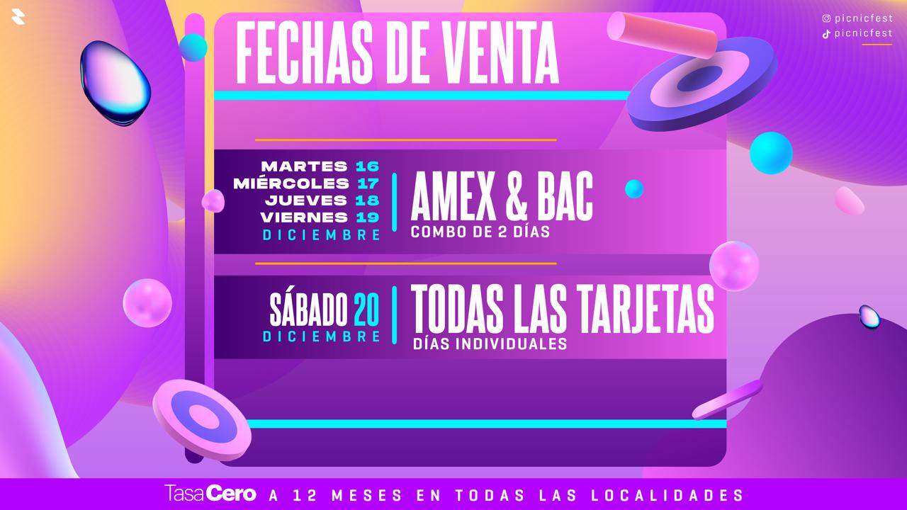 Localidades y precios: En cuanto a las localidades, Picnic Festival Centroamérica 2026 ofrecerá distintas experiencias para el público, con precios diferenciados para promociones de dos días y entradas por día individual, disponibles a través de eticket.