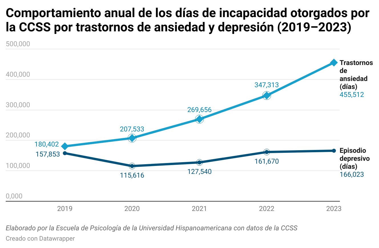 Según datos de la Caja Costarricense del Seguro Social entre 2019 y 2023, los días de incapacidad por trastornos de ansiedad aumentó un 152%, al pasar de 180.402 a 455.512 días. Mientras, los episodios por depresión variaron de 157.853 a 166.023 días, un crecimiento moderado del 5.18%