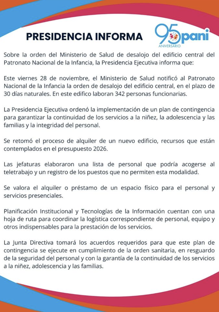 De acuerdo a la información que Presidencia compartió a los empleados, el PANI retomó el proceso de alquiler de un nuevo edificio y anunció que los recursos “están contemplados en el presupuesto 2026”. Del mismo modo, anunció que las jefaturas elaboraron una lista de personal que podría acogerse al teletrabajo y un registro de los puestos que no permiten esta modalidad.