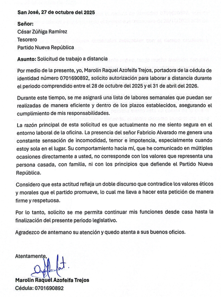 En el documento, Azofeifa solicitó a César Zúñiga Ramírez, tesorero del PNR y candidato a diputado por San José, autorización para laborar de manera remota hasta el final del actual periodo constitucional, al alegar que no se sentía segura en su entorno laboral debido a la presencia de Alvarado Muñoz.