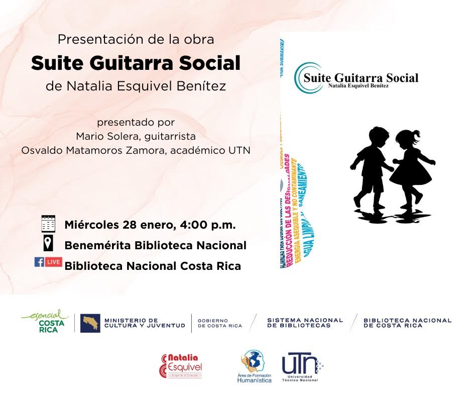 Invitan: Ministerio de Cultura y Juventud, Benemérita Biblioteca Nacional del SINABI, Área de Formación Humanística de la UTN y Natalia Esquivel (compositora).