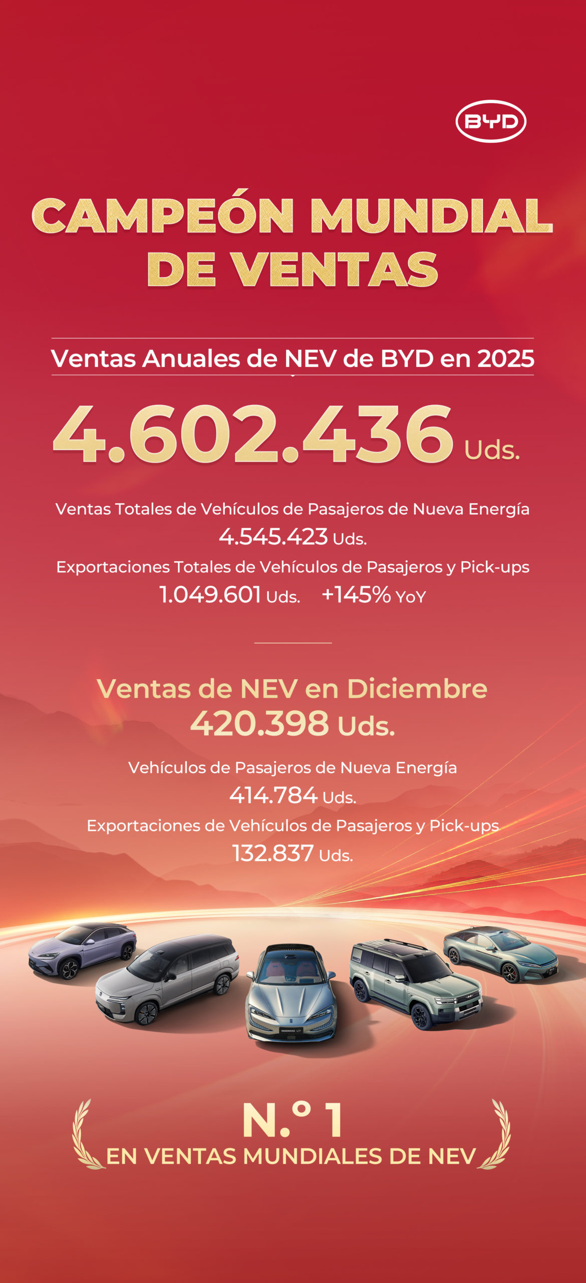 La transición hacia la movilidad eléctrica continúa acelerándose a nivel mundial y BYD se posiciona como el principal actor del sector, al cerrar el 2025 como la marca con mayores ventas de Vehículos de Nueva Energía (NEV) en el mundo.