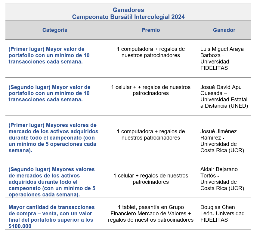 La actividad reunió a competidores, familiares, representantes de universidades y del Consejo Nacional de Rectores (CONARE), así como a actores del mercado de capitales y patrocinadores, quienes acompañaron el cierre de una iniciativa que busca acercar a la población universitaria al funcionamiento del mercado de capitales costarricense. Durante el evento se premió el desempeño de los competidores, destacando sus habilidades en la toma de decisiones de inversión, el análisis financiero y la comprensión de la dinámica del mercado, en condiciones que replican escenarios reales.