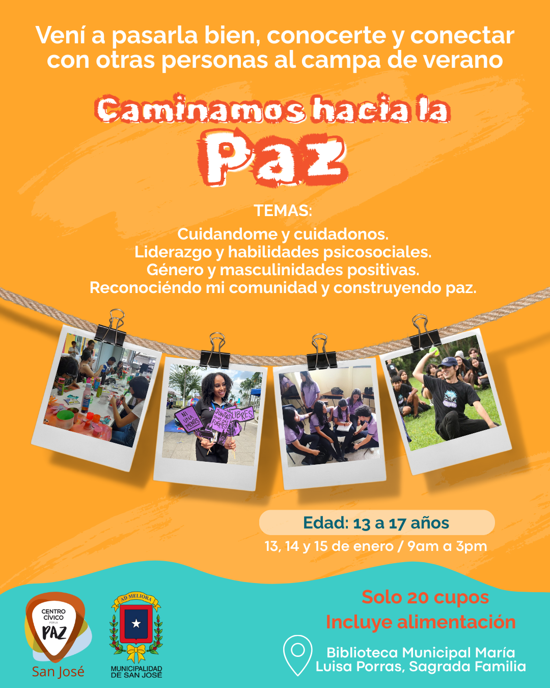 El Centro Cívico por la Paz de San José organizará un campamento gratuito dirigido a personas adolescentes de entre 13 y 17 años, el cual se desarrollará del martes 13 al jueves 15 de enero en las instalaciones de la Biblioteca Municipal María Luis Porras, ubicada en Sagrada Familia.