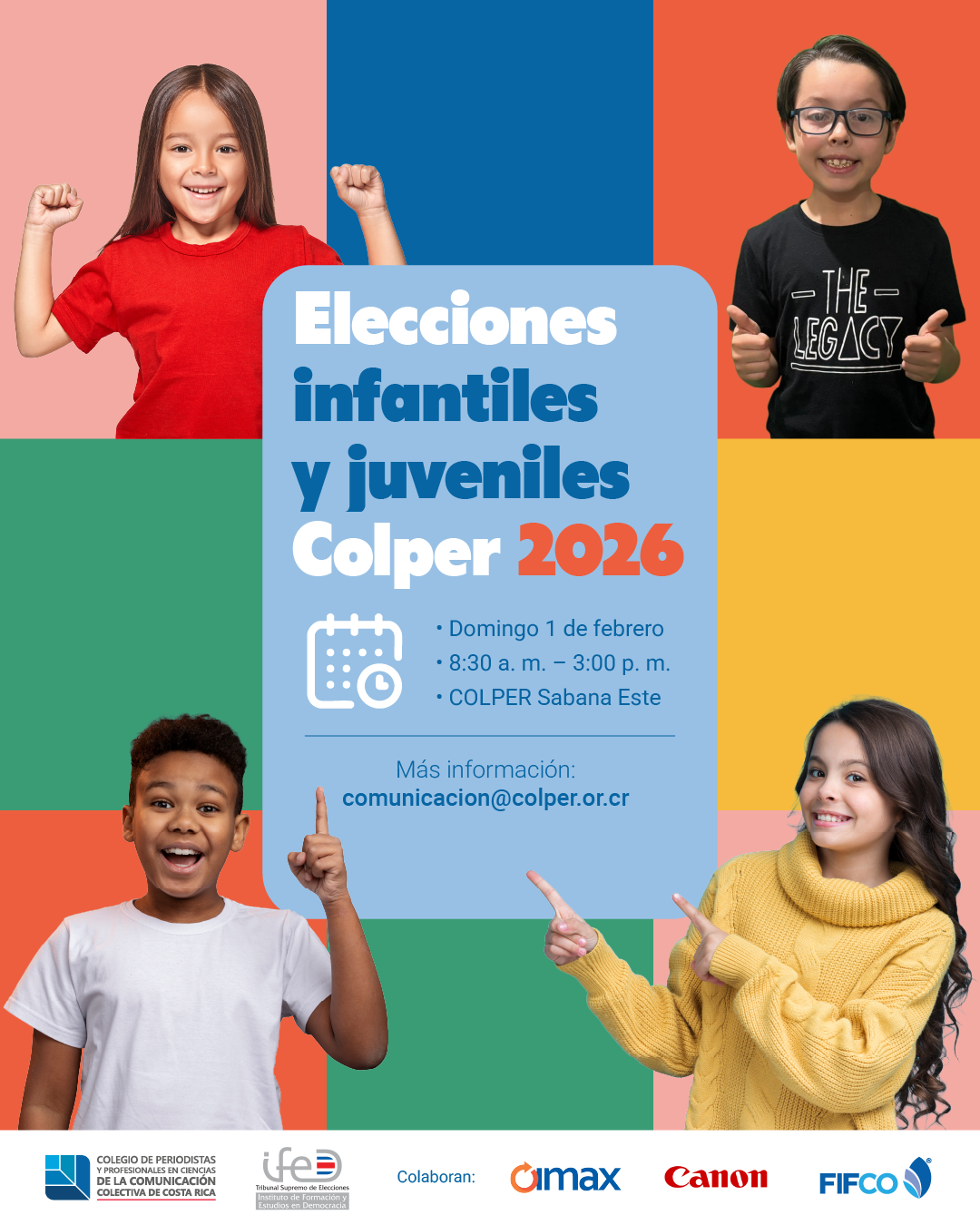 Con el objetivo de fomentar la educación cívica y la participación democrática desde edades tempranas, el Colegio de Periodistas y Profesionales en Ciencias de la Comunicación Colectiva de Costa Rica (COLPER) realizará, las Elecciones Infantiles y Juveniles 2026, el próximo domingo 1 de febrero, en un horario de 8:30 a. m. a 3:00 p. m., en su sede ubicada en Sabana Este.