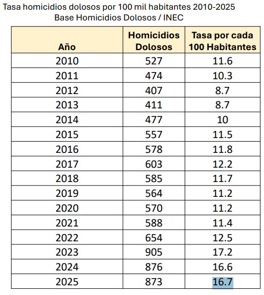Los homicidios de 2025 solo son superados por los registrados en 2023 (905) y 2024 (876).