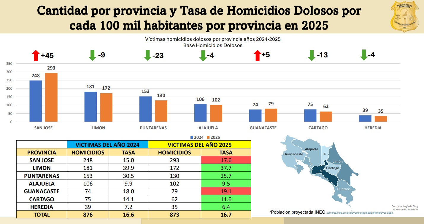 Al cierre del 2025, San José encabezó la lista de provincias con más muertes por esta causa al registrar 293, 45 más que el año anterior. En detalle, la situación por provincias es la siguiente (en paréntesis la diferencia con el año anterior):