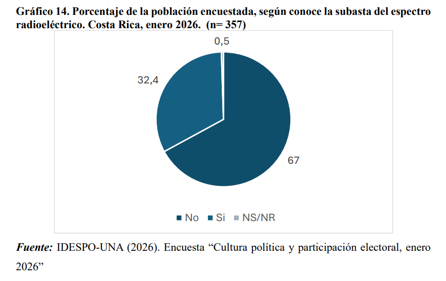 Pese a la discusión pública generada, la encuesta revela un alto nivel de desconocimiento. Un 67% de las personas consultadas indicó no conocer el proceso liderado por el Poder Ejecutivo, el Ministerio de Ciencia, Innovación y Tecnología (Micitt) y la Superintendencia de Telecomunicaciones (Sutel), mientras que un 32.4% señaló que sí la conoce y un 0.5% dijo no saber o no respondió.