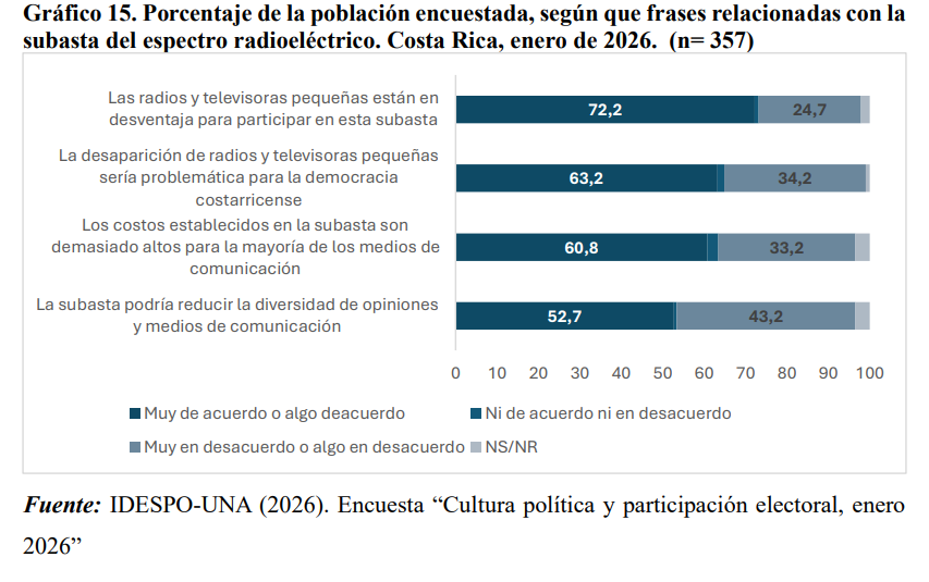 El estudio incluyó un apartado específico para conocer la opinión ciudadana sobre la iniciativa promovida desde el Poder Ejecutivo para abrir un proceso de adjudicación de frecuencias. Este proceso ha sido cuestionado por empresas de comunicación, principalmente pequeñas, que han calificado las condiciones como inviables y han advertido que cesarían operaciones en caso de que la subasta avance. El procedimiento se encuentra actualmente bajo análisis de la Sala Constitucional, tras un recurso de amparo tramitado en el expediente 25-031501-0007-CO.