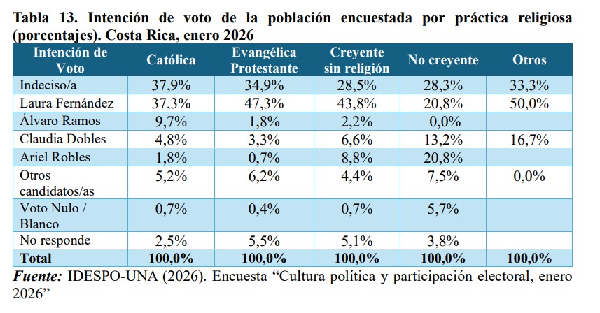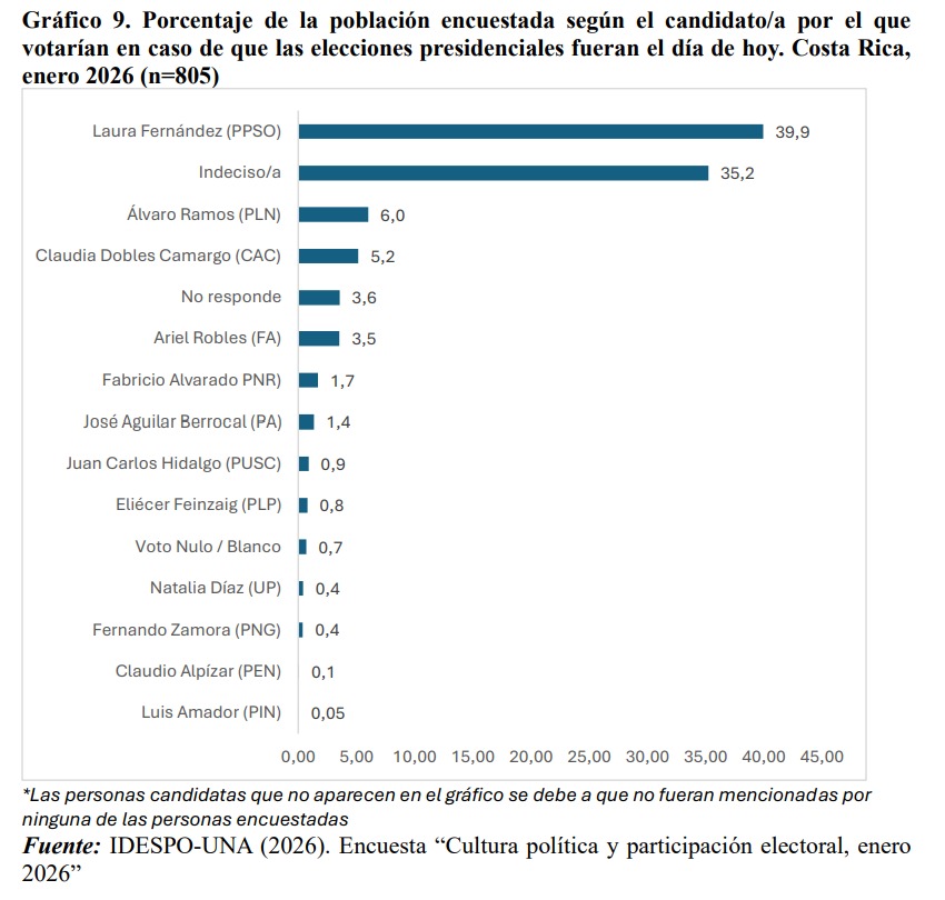 Este 22 de enero se dio a conocer la más reciente encuesta política del Instituto de Estudios Sociales en Población (Idespo) de la Universidad Nacional (UNA). El estudio indica que, entre las personas decididas a votar el próximo 1 de febrero en las elecciones nacionales, un 39.9% apoyaría a la candidata Laura Fernández Delgado, del oficialista Partido Pueblo Soberano (PPSO).