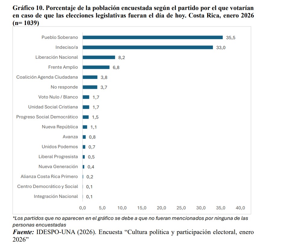 Si se trata de votar por la conformación de la próxima Asamblea Legislativa, Pueblo Soberano también obtienen mayoría de apoyos con un 35.5%. Le siguen el PLN (8.2%), el FA (6.8%) y la CAC (3.8%).