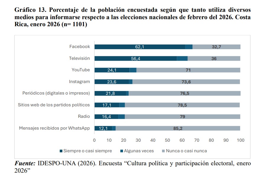 Sobre los medios en los cuales la población se informa de las elecciones, la red social Facebook destaca con un 62.1% de quienes dicen siempre o casi siempre. Le siguen en orden descendente la televisión (56.4), YouTube (24.1%), Instagram (23.6%), medios digitales o impresos (21.8%), sitios web de partidos políticos (17.1%) y radio (16.4%).