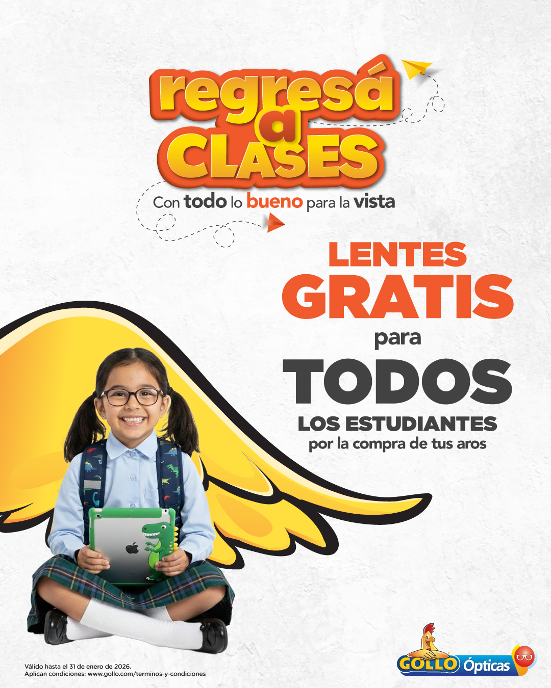 Los aros adquiridos cuentan con una garantía de 12 meses por defectos de fabricación. Los estudiantes que ya cuenten con una receta visual previa podrán presentarla; sin embargo, Gollo Ópticas recomienda validar la prescripción mediante el examen visual gratuito incluido en el programa, para asegurar la correcta adaptación de los lentes.