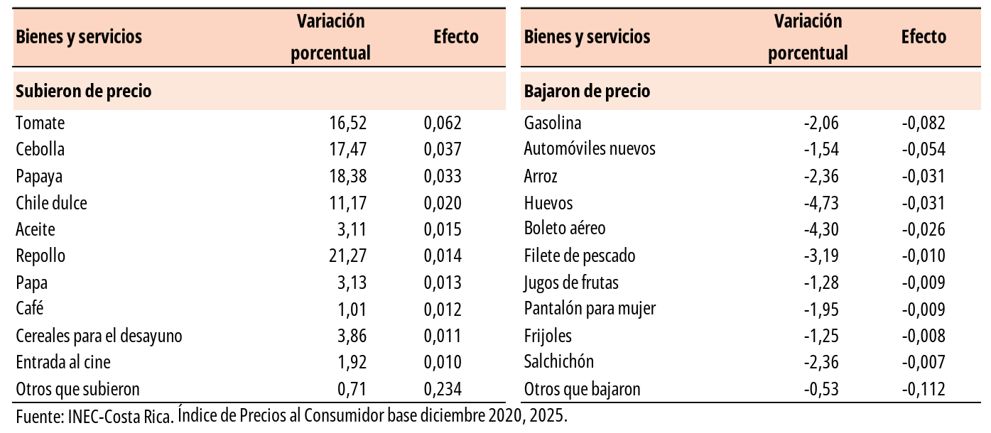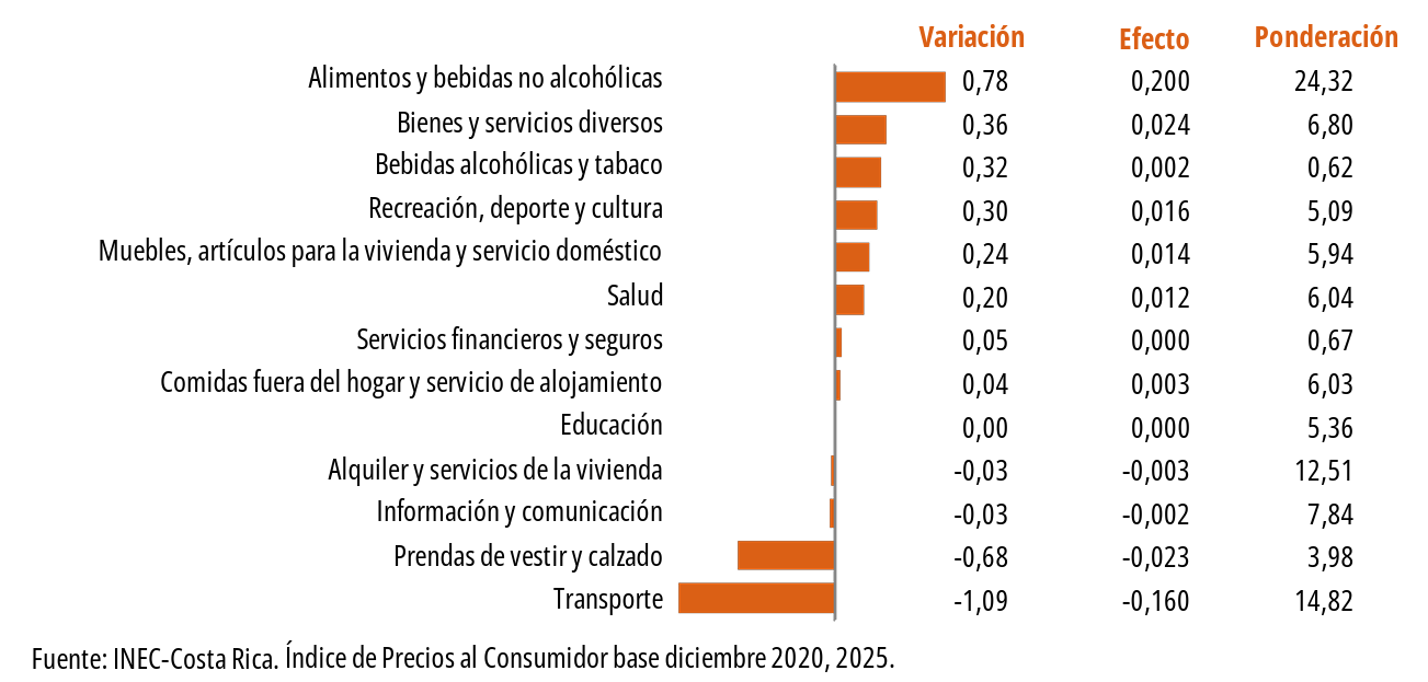 En diciembre de 2025, el Índice de Precios al Consumidor presentó una variación mensual de 0,08%, aumentando por tercera vez consecutiva. A pesar de estos incrementos, el índice cerró el 2025 con una variación acumulada en el año de -1,23%, siendo apenas la segunda vez en la última década que el indicador registró una variación anual negativa. Con respecto a los resultados de diciembre, la división de alimentos y bebidas no alcohólicas fue la que más contribuyó al alza del índice durante el mes, debido principalmente a incrementos de precios del tomate, cebolla, papaya, chile dulce y aceite. En cuanto a disminuciones de precios sobresalen algunos artículos como gasolina, automóviles nuevos, arroz, huevos y boleto aéreo".