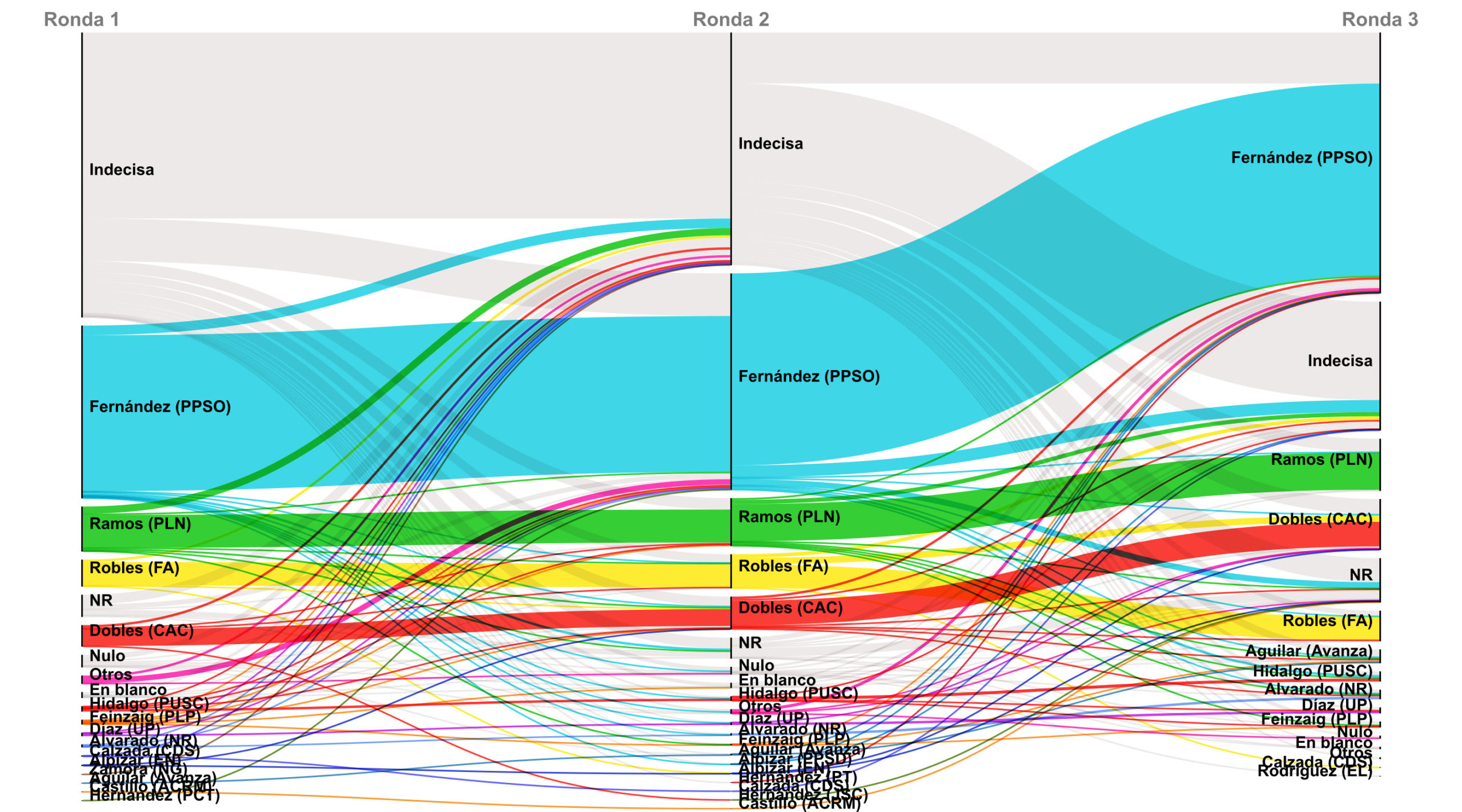 Adicionalmente, el informe destaca que, entre las otras candidaturas, no hay grandes flujos de pérdida o ganancia, ni entre ellas, ni entre estas y la candidatura del oficialismo.