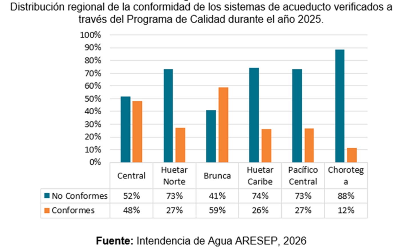 Según detalló Aresep, "las principales deficiencias se concentran en los procesos de desinfección, por la ausencia de cloración o un control inadecuado del cloro residual, así como en incumplimientos microbiológicos, lo que representa un riesgo sanitario relevante para la población. La cloración es la principal barrera de protección ante contaminación microbiológica, por lo que se requieren medidas correctivas inmediatas por parte de los operadores del servicio público de acueducto". Desde Aresep añadieron: